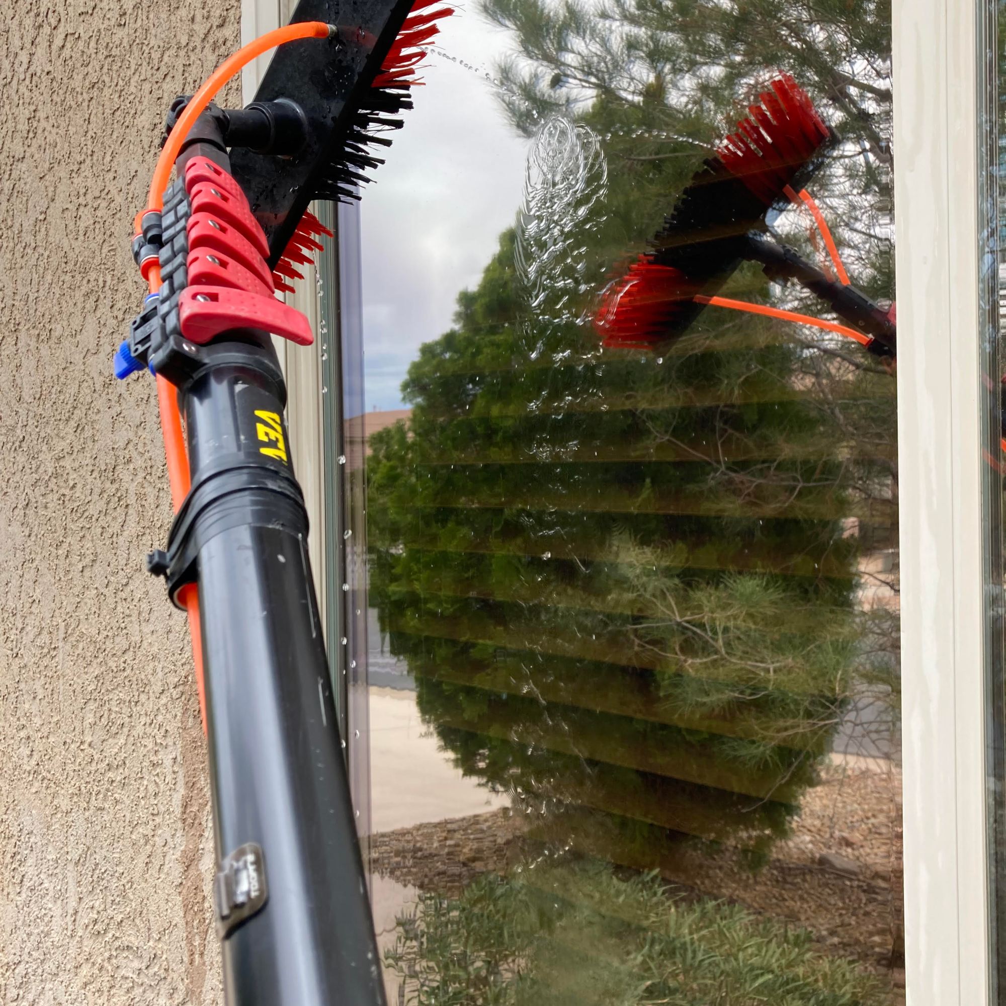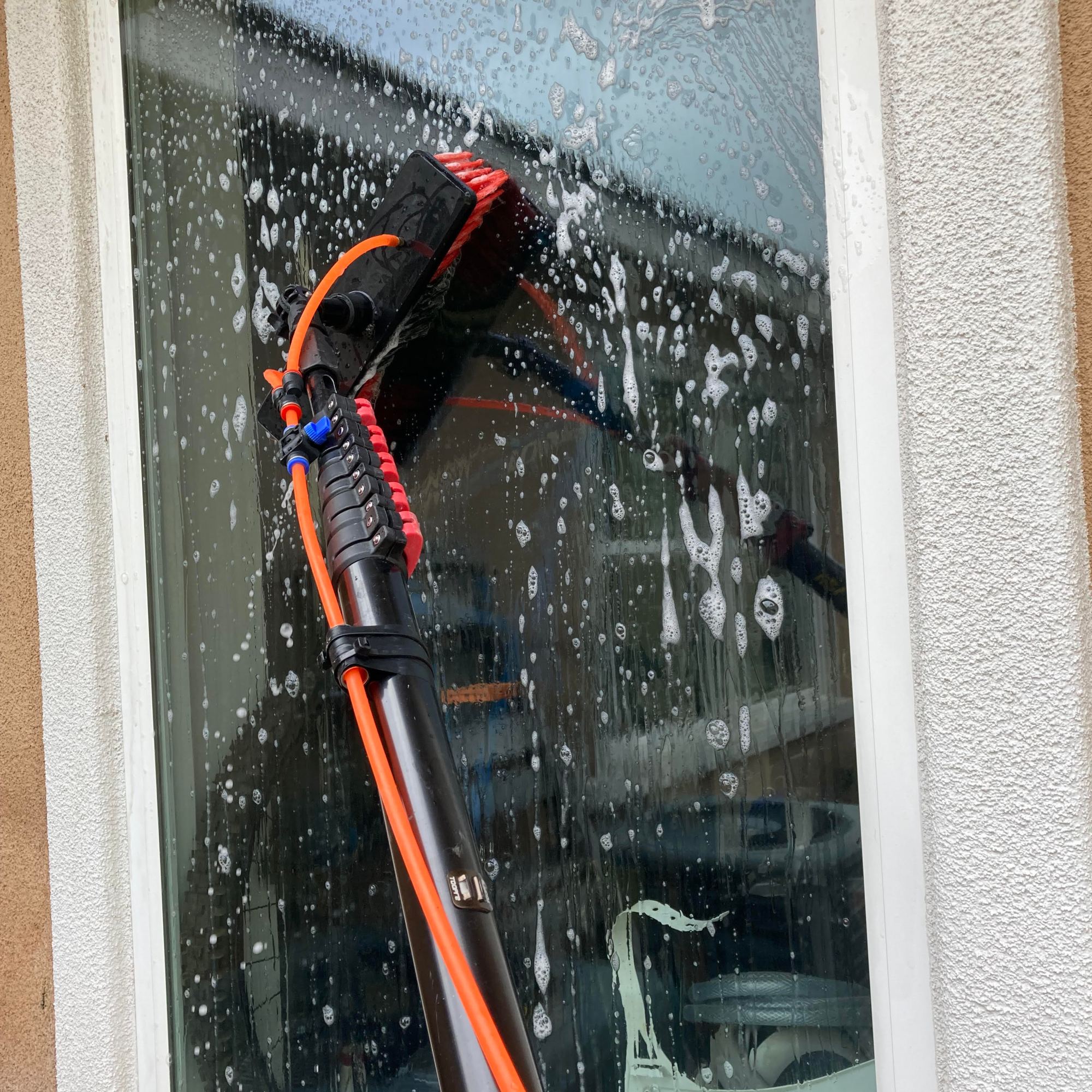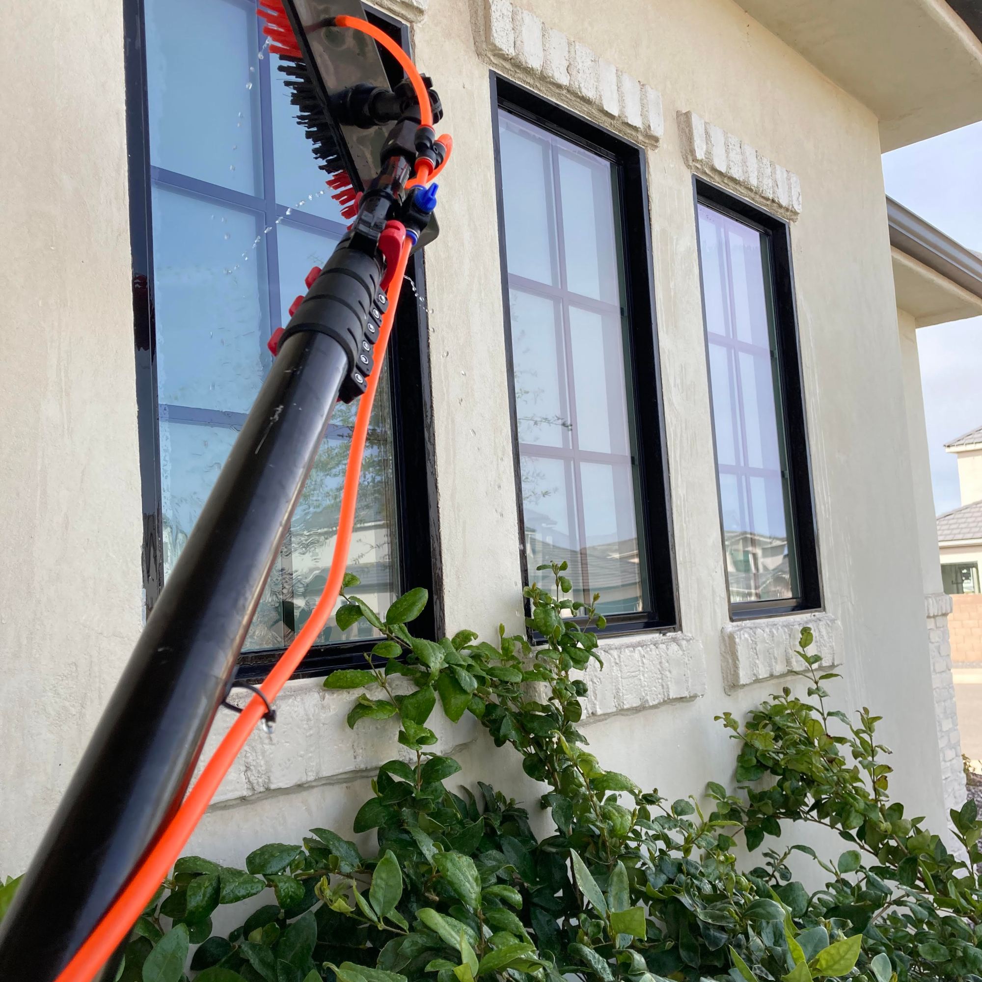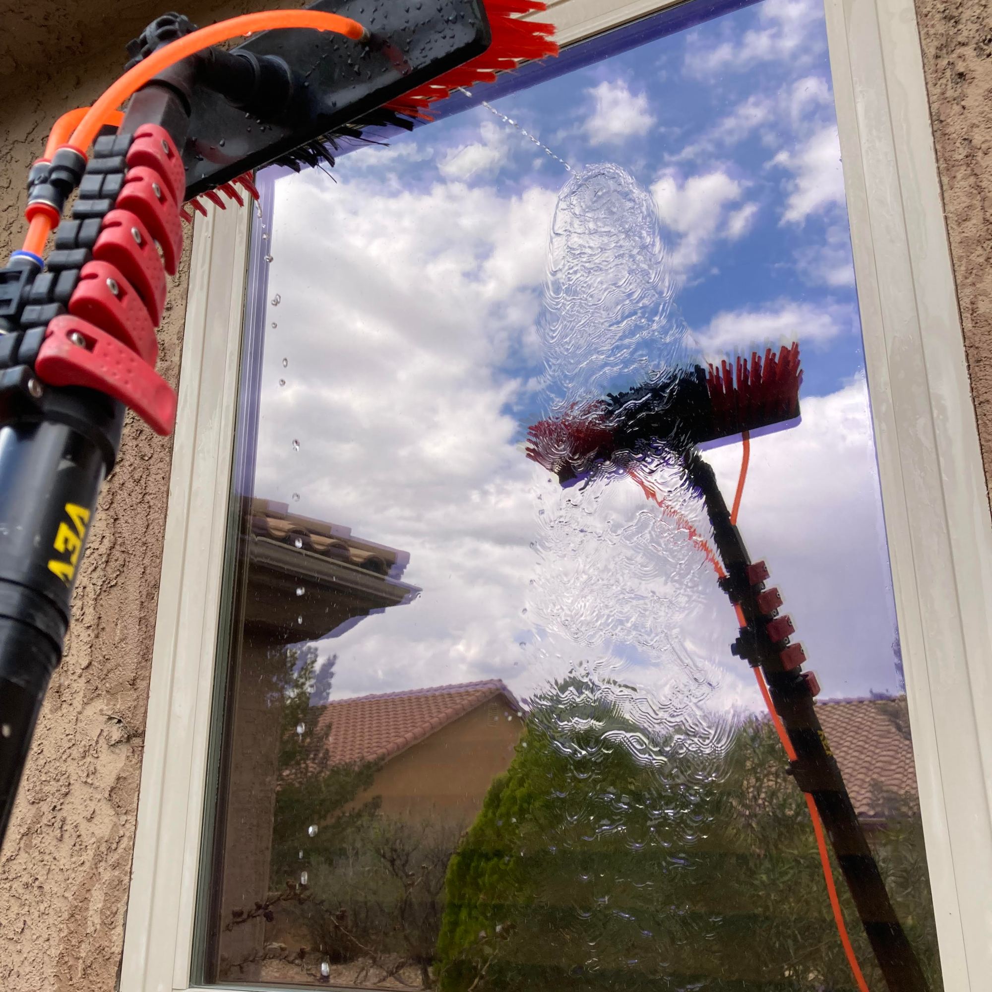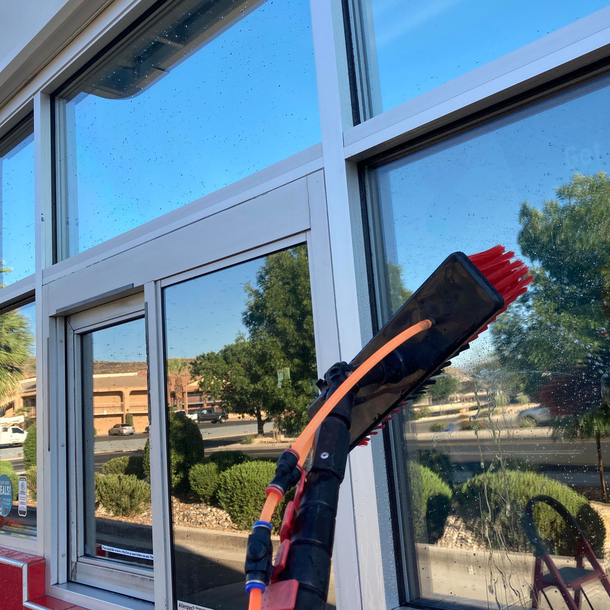 Naked windows! A water filtration system is used to bring out that reflective shine. Three filters are used to convert the water into 100% PURE water! The water leaves the filters with ZERO TDS (total dissolved solids), so the water will evaporate, no need for a squeegee.